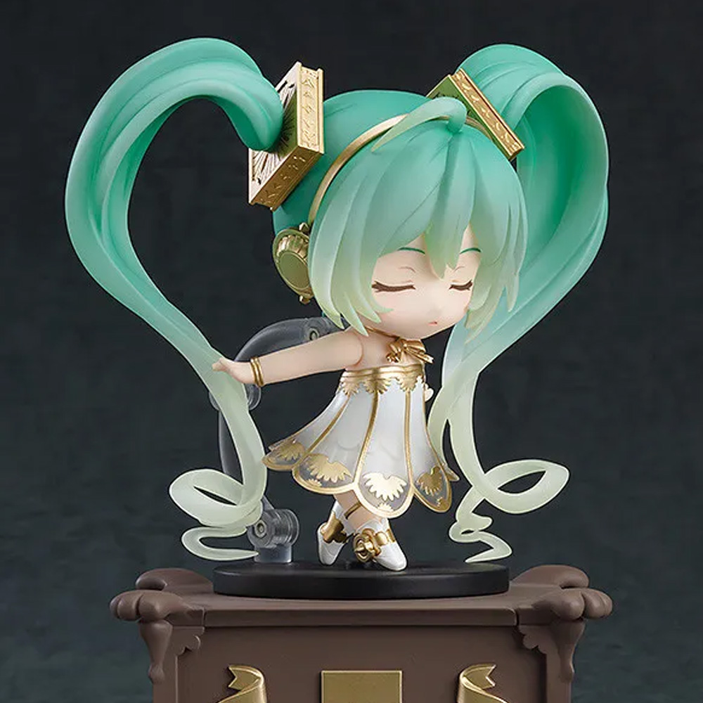 From Character Vocal Series 01: Hatsune Miku comes a Nendoroid of Hatsune Miku based off of the main visual from the full orchestra concert Hatsune Miku Symphony 2020 ~5th Anniversary~. The Nendoroid faithfully captures the beautiful design originally illustrated by Rella. She comes with two face plates including a smiling expression and an expression with closed eyes.Her gramophone-inspired dress has been recreated in detail with translucent parts and gold paintwork. The Nendoroid also comes included with a box-style stand that can also be used as a storage box. Additionally, a joined hands part that can be used with Nendoroid Hatsune Miku: Symphony 2018-2019 Ver. (sold separately) to display them holding hands is included as well. Be sure to add her to your collection!